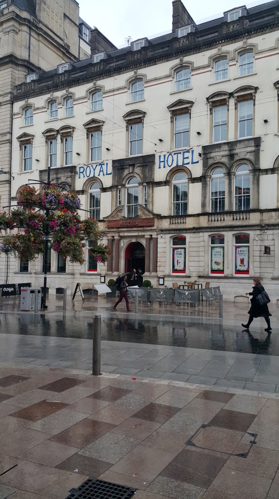 Arriving in Cardiff became an adventure in its own right. The skies had opened up and it was raining hard. The Hotel we booked had no parking but had a loading bay where you could drop luggage before heading down the road to park the car. Only problem was it was so wet you could not read the road markings. We ended up using bus lanes (possibly illegally) and going round and round in circles. We ended up parked on a Bus stop and phoning the hotel to find out where the loading bay was. As it turned out it was right behind us but there was a massive Skip Bin dropped on it so you would never know. The hotel sent 2 lads done to assist with the luggage and we checked in while Rick went off and parked the car in the parking building.